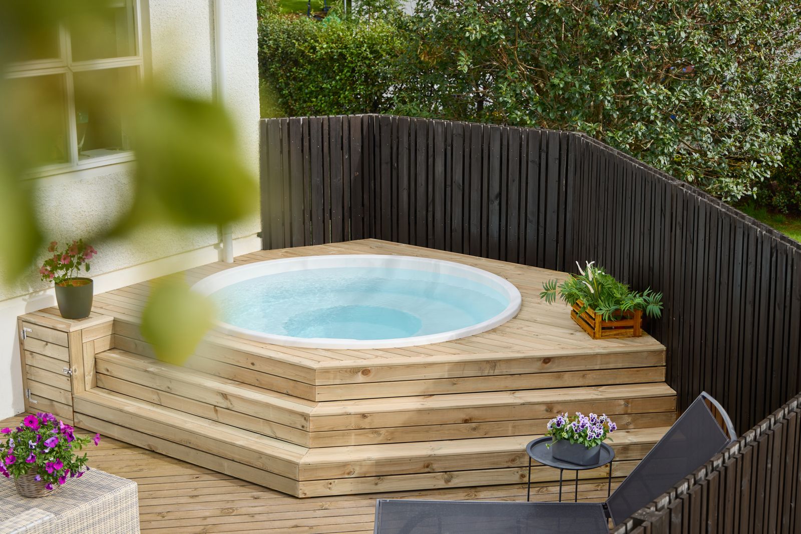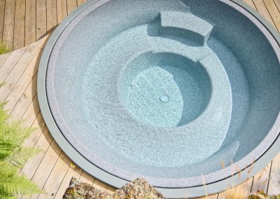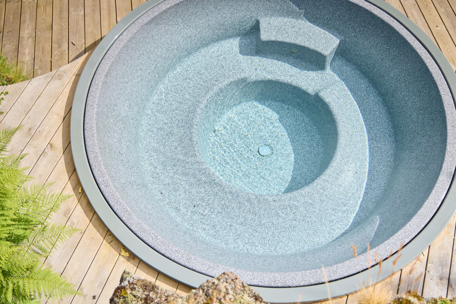 Undir yfirborðinu er sterkt lag úr trefjaplasti (fiberglass) sem gerir pottinn sjálfberandi. Því þarf ekki að smíða flókna burðargrind, og potturinn heldur lögun sinni ár eftir ár – jafnvel í miklum hita- og kuldasveiflum.